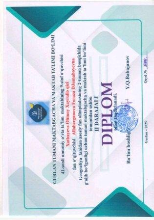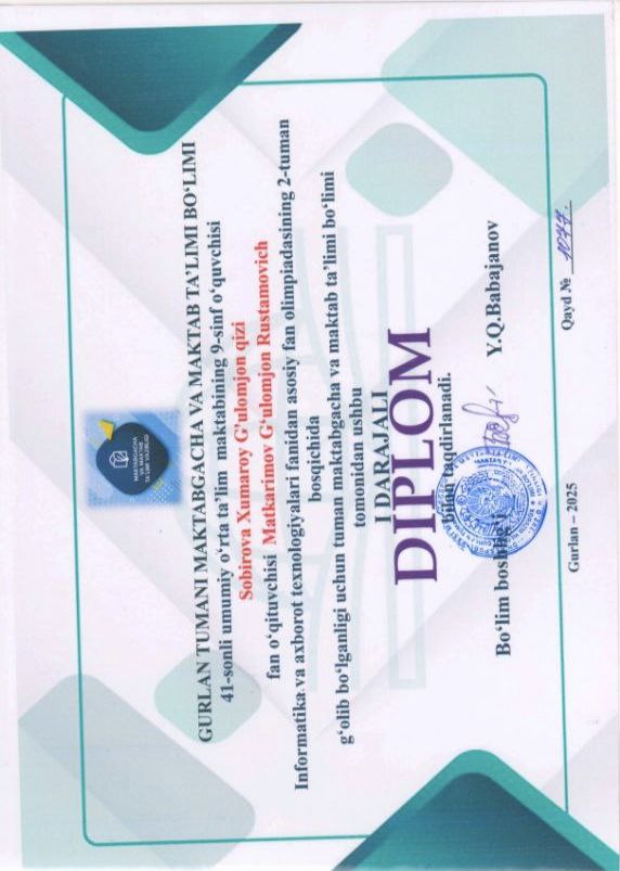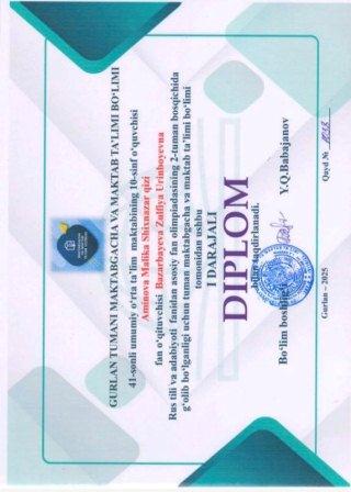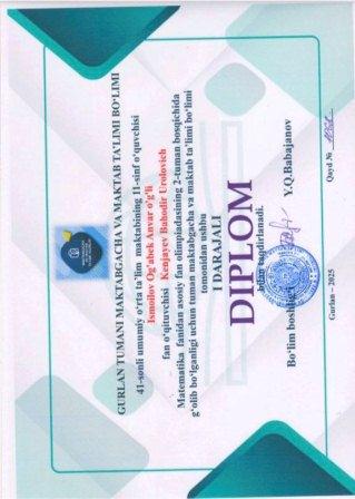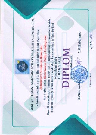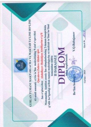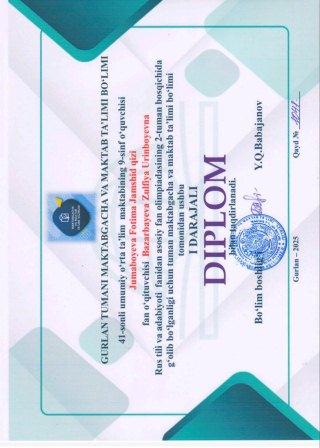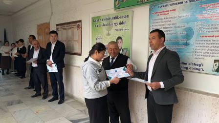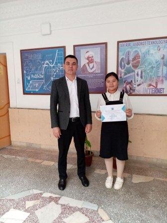 Asosiy fan olimpiadasi tuman bosqichi g'oliblari tuman maktabgacha va maktab bo'limi tomonidan diplomlar bilan taqdirlandilar. G'olib o'quvchilarni taqdirlash marosimi bugun ertalab ertalabki saflanishda maktab ustozlar va yuqori sinf oʻquvchilari bilan o'tkazildi. Unda maktabimiz direktori ustoz Yo'ldosh aka Allayarov tabrik so'zlarini bildirdi. Tuman fan olimpiadasida g'olib boʻlgan o'quvchilar va ustozlarini e'tirof etib ular olqishlandi va olimpiada viloyat bosqichida tumanimiz sharafini munosib himoya qilishlariga ishonch bildirdi. Bu o'quv yilida maktabimiz o'quvchilaridan 7 nafari g'oliblar safidan joy olishdi. Jumladan matematika fanidan 11-sinf o'quvchisi Ismoilov Og'abek Anvar o'g'li (8,9,10-sinf vaqtida ham tumanda tengsiz deb topilgan, o'qituvchisi Kenjayev Bahodir) , rus tili fani oʻqituvchisi Bazarboyeva Zulfiyaning o'quvchilari 10-sinf o'quvchisi Aminova Malika Shoxnazar qizi, 9-sinf o'quvchisi Jumaboyeva Fotima Jamshid qizi rus maktab o'quvchilaridanda yuqori ball toʻplab faxrli 1-o'rinni, 11-sinf o'quvchisi Jumaboyeva Mushtariy Bobur qizi 2-o'rinni egalladilar. Informatika fani oʻqituvchisi Matkarimov G'ulomjonning o'quvchisi Sobirova Xumoroy G'ulomjon qizi 1-o'rin, geografiya fani oʻqituvchisi Allaberganova Feruzaning o'quvchisi Xaytboyeva Oltinoy Xayrullo qizi 2-o'rin, matematika fani oʻqituvchisi Abdullayev Hamidjonning o'quvchisi Qurolova Zuhra Alisher qizi faxrli 2-o'rinni egallab tuman maktabgacha va maktab bo'limining 1,2-darajali diplomlari bilan taqdirlandilar. Shuningdek yana 10 nafar atrofida o'quvchilar 4-,5- o'rinlarni egalladilar. Bu o'quvchilarimizga ham minnatdorchilik bildirildi. 24-noyabr kunidan boshlab asosiy fan olimpiadasi viloyat bosqichi boshlanadi. Dastlab 11-sinf o'quvchisi Ismoilov Og'abek ushbu bosqichda qatnashadi. Barcha o'quvchilarimiz asosiy fan olimpiadasi viloyat bosqichida muvaffaqiyatli ishtirok etib g'oliblar safidan joy olishadi deb umid qilamiz.